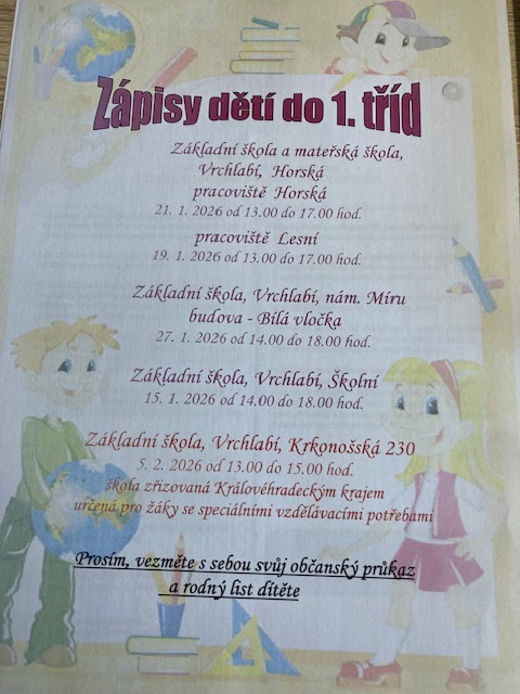 Slavnostní zápisy do 1. tříd na ZŠ Lesní 30 se konají v pondělí 19. ledna 2026 od 13:00 do 17:00 hodin a na ZŠ Horská 256 ve středu 21. ledna 2026 od 13:00 do 17:00 hodin. Rodiče vezměte s sebou rodný list dítěte a svůj občanský průkaz. Dostavte se i v případě, že budete žádat o odklad školní docházky. Těšíme se na vás!