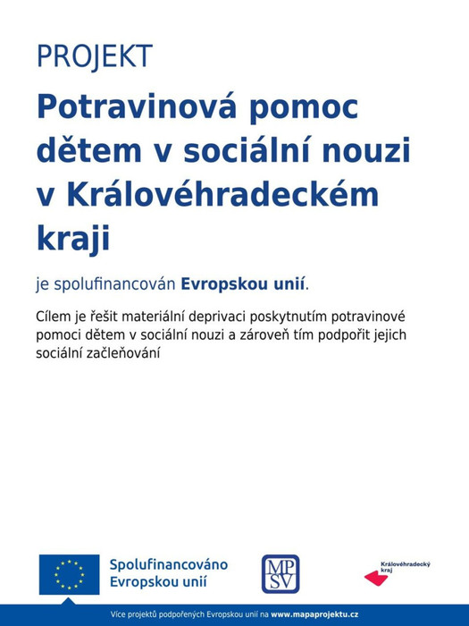Potravinová pomoc dětem v sociální nouzi v Královéhradeckém kraji je spolufinancován Evropskou unií.