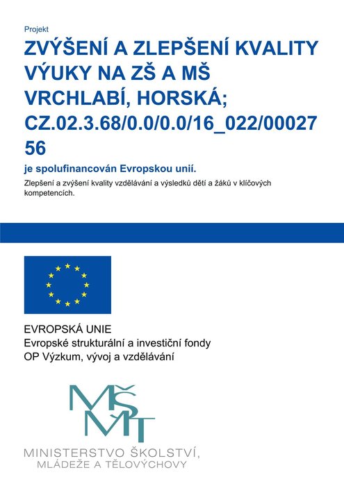 Zvýšení a zlepšení kvality výuky na ZŠ a MŠ Horská, Vrchlabí CZ.02.3.68/0.0/0.0/16_022/0002756 je spolufinancován Evropskou unií.